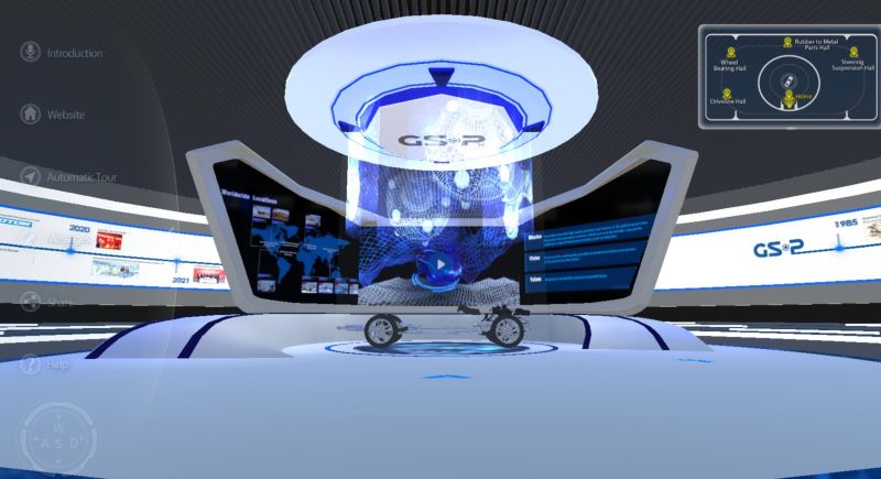展厅为三维建模,可进行虚拟漫游,点击地面任意位置即可前进到该位置,按住鼠标按键:WSAD键可进行移动,或者点击地面蓝色方向键可直接跳跃到该场景,并且视角可自动转换到所展示内容上;点击右上角小地图,可进行展厅切换;点击展厅里的各个图标查看各类展示类容,包括图文、视频以及互动内容;零部件三维模型展示:可360旋转观看,鼠标左键进行旋转,鼠标中键可进行放大缩小;